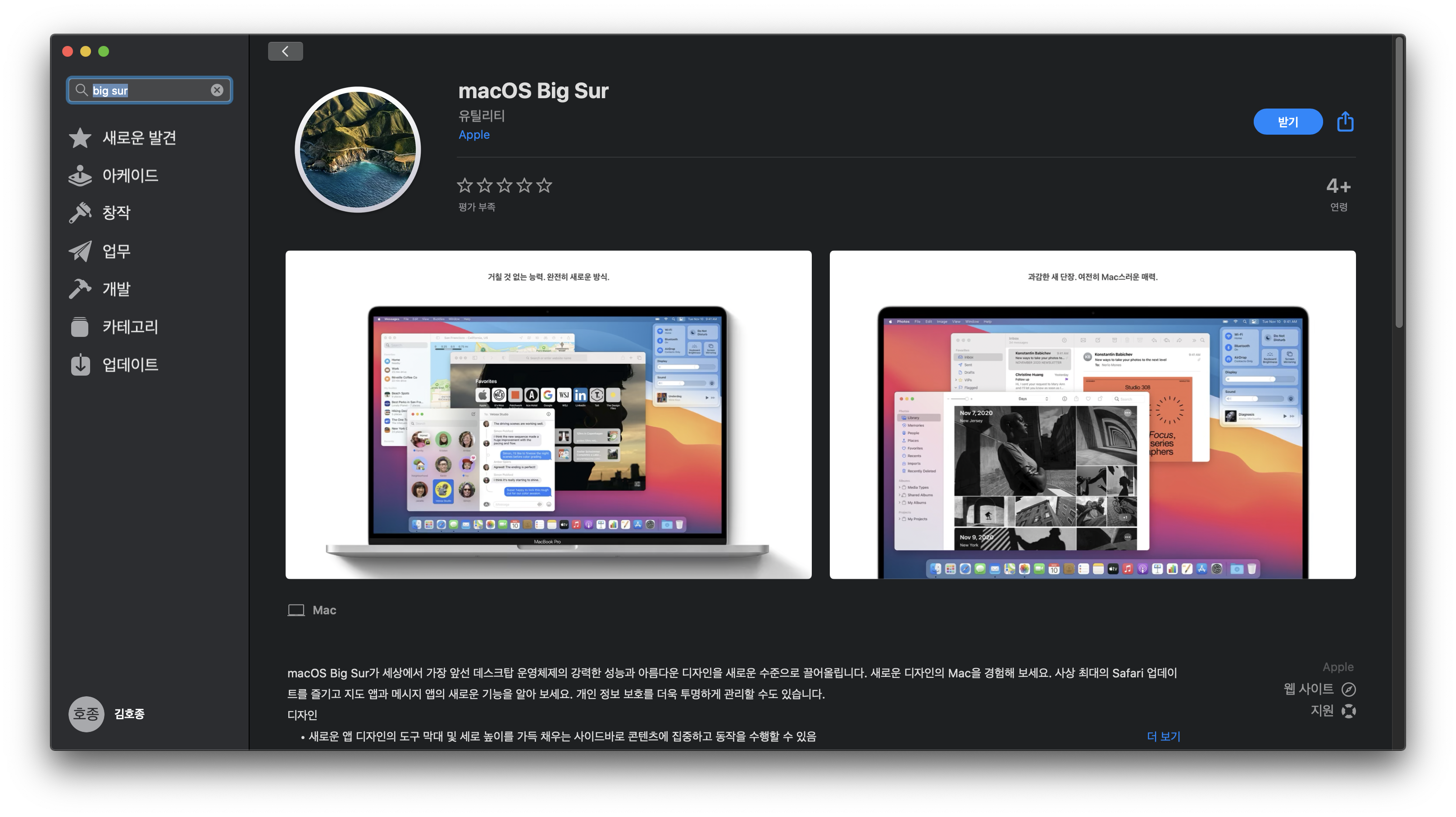 우선 다운로드 시간이 오래걸리므로, App Store에서 Big Sur를 찾아 다운받으며 진행합니다.