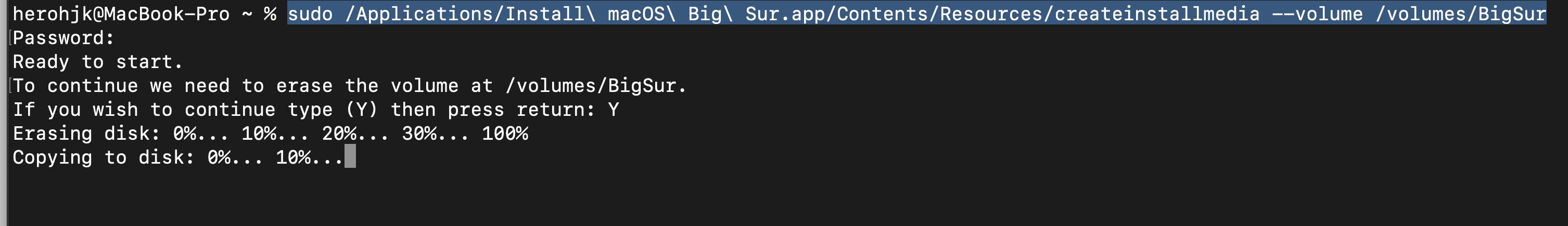 (전체 명령어는 이렇습니다. sudo /Applications/Install\ macOS\ Big\ Sur.app/Contents/Resources/createinstallmedia --volume /volumes/BigSur)