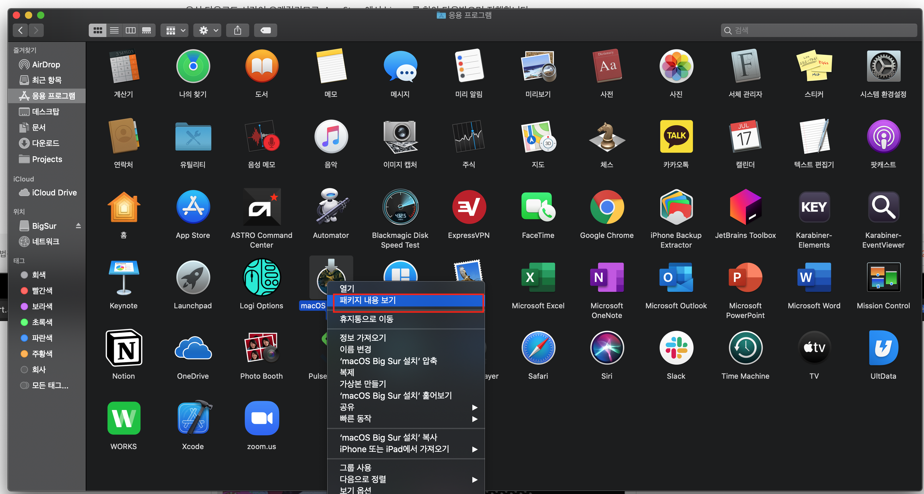 이후 다운로드가 완료되면 응용프로그램 디렉토리에 macOS Big Sur 설치 라는 소프트웨어가 설치되어 있습니다.