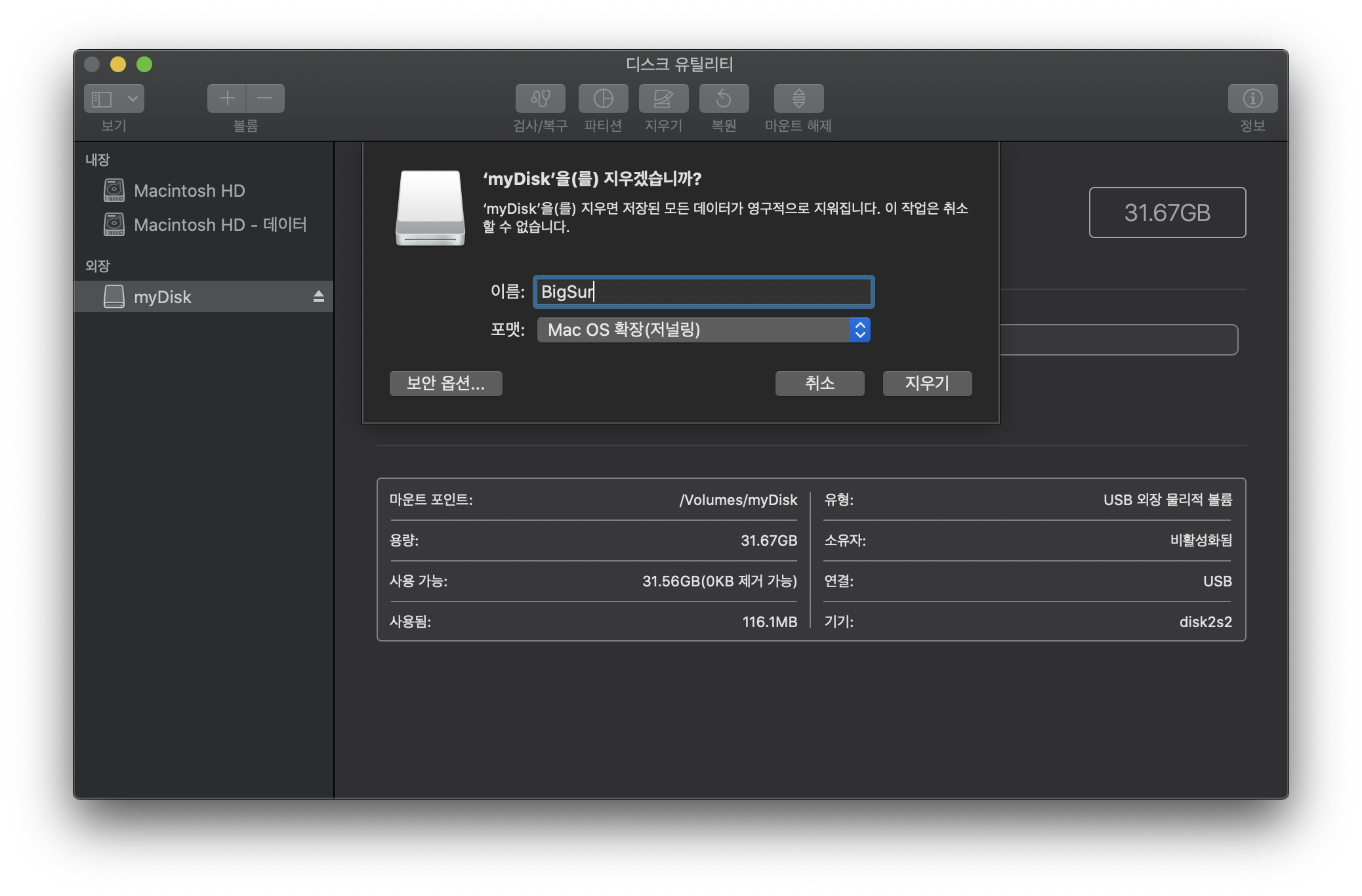 그리고 다운로드를 받는 동안, 개인 자료들이 있으면 백업을 해 두신 후, 빅서 설치용 USB를 마운트 후 포맷을 한번 돌려줍니다.