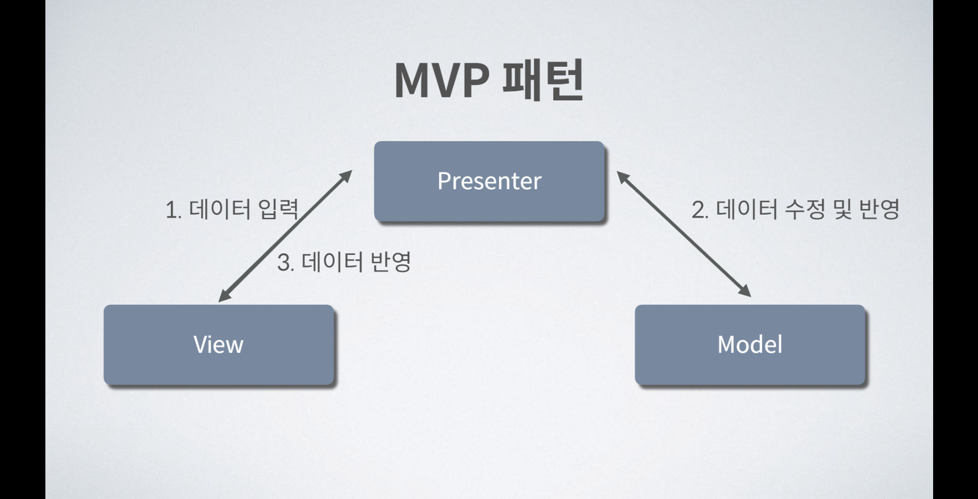 MVC와 비슷하지만, Model이 데이터를 View가 아닌, Presenter로 보내준다는데에서 차이점이 있습니다.